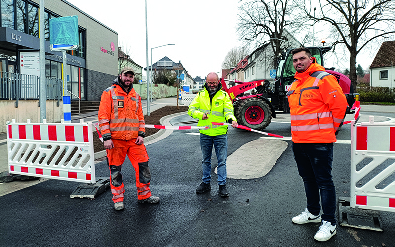 Von links nach rechts: Mitarbeitende der Firma Kemna Bau Andreae GmbH, Detlef Wehrmann (Fachbereichsleiter Bauen und Stadtentwicklung) und Christoph Ettrich (Ingenieurbüro Röver) bei der Freigabe der Bahnhofstraße. Foto: Stadt Blomberg