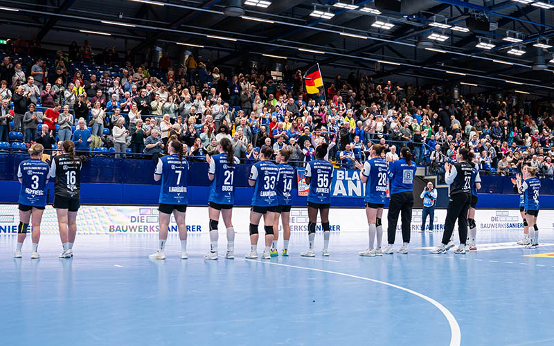 Die Spielerinnen der HSG Blomberg-Lippe bedankten sich nach dem Remis bei ihren Fans. Foto: Timon Peters