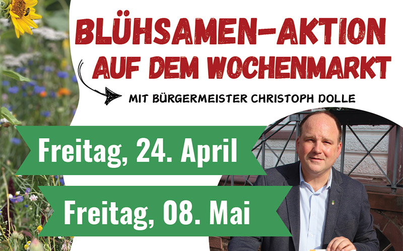 Bürgermeister Christoph Dolle wird die Tütchen mit bienen- und insektenfreundlichem Saatgut für bis zu zehn Quadratmeter am Freitag, 24. April, sowie am Freitag, 8. Mai, zwischen 9 und 12 Uhr auf dem Blomberger Wochenmarkt persönlich ausgeben.